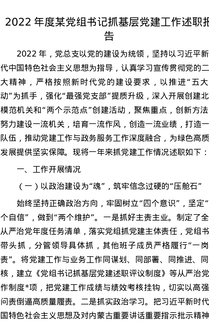 2022年度某党组书记抓基层党建工作述职报告