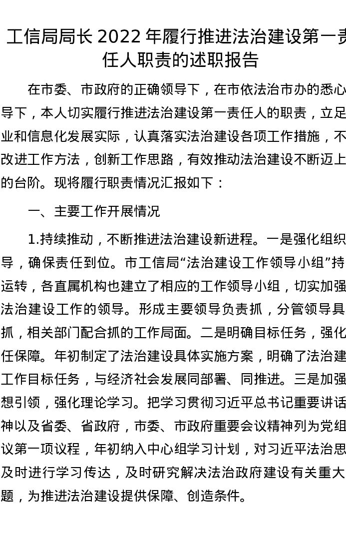 工信局局长2022年履行推进法治建设第一责任人职责的述职报告