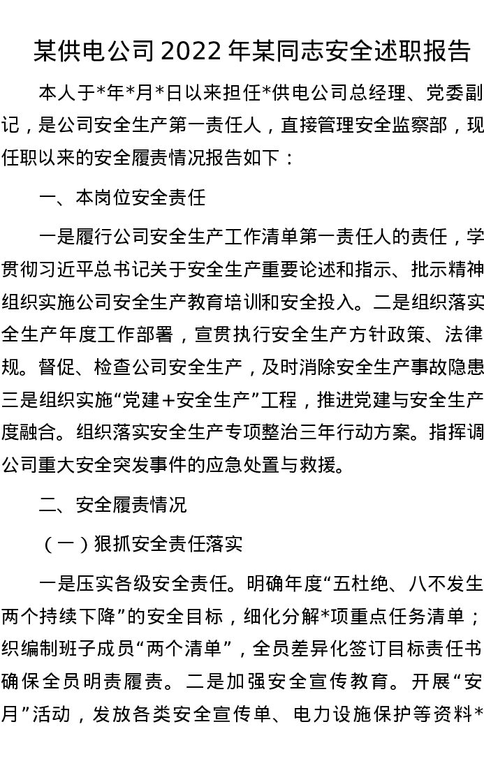 某供电公司2022年某同志安全述职报告