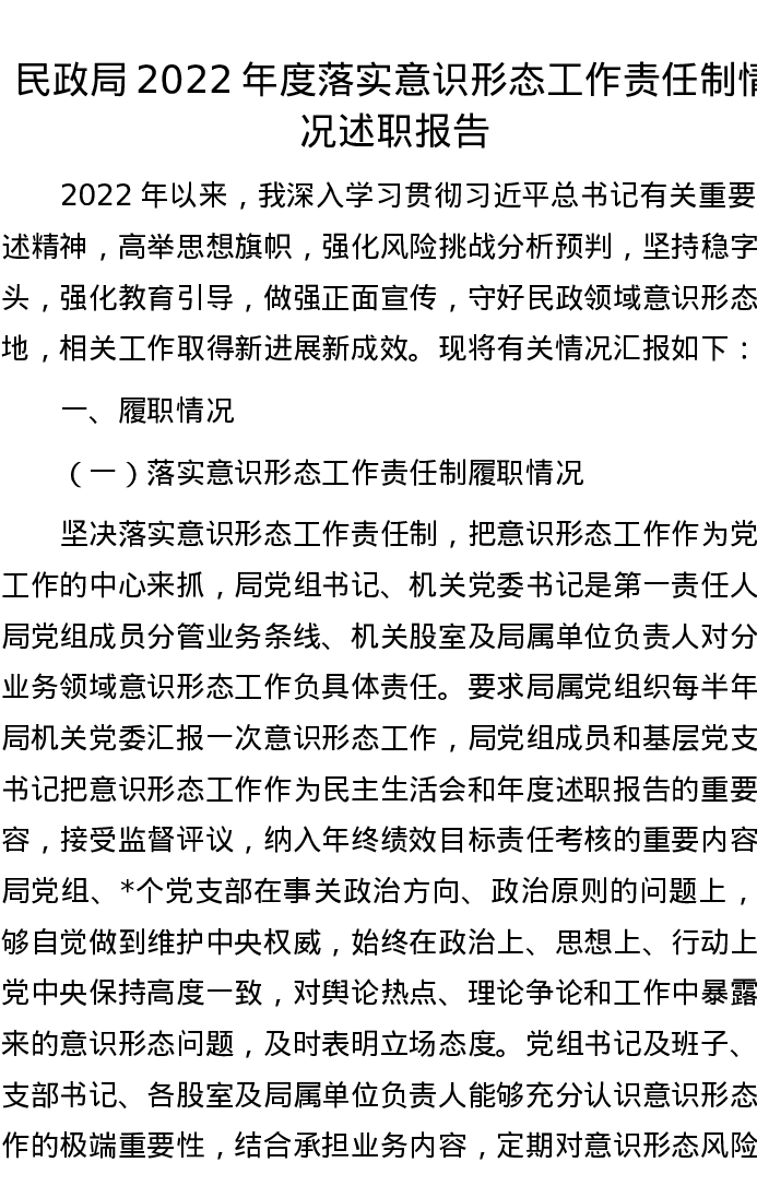 民政局2022年度落实意识形态工作责任制情况述职报告