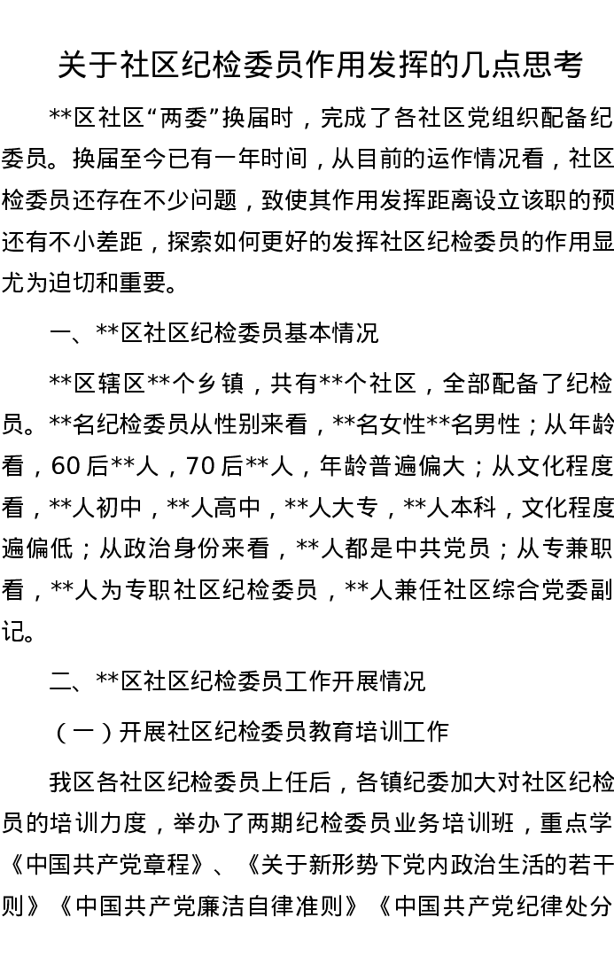关于社区纪检委员作用发挥的几点思考