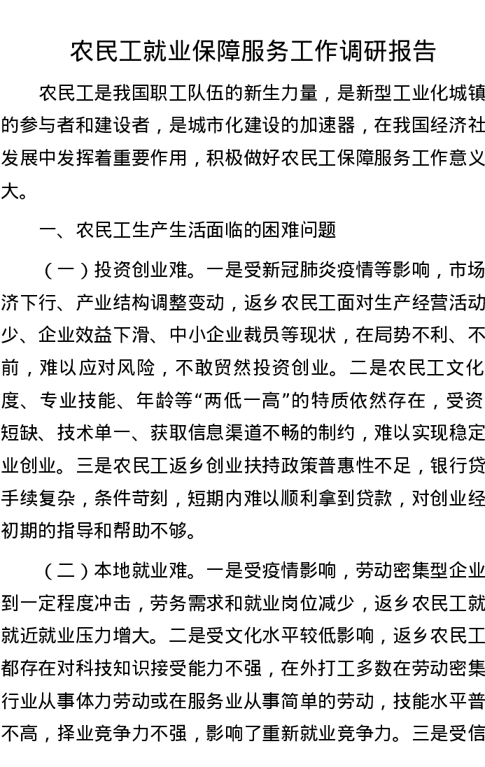 农民工就业保障服务工作调研报告