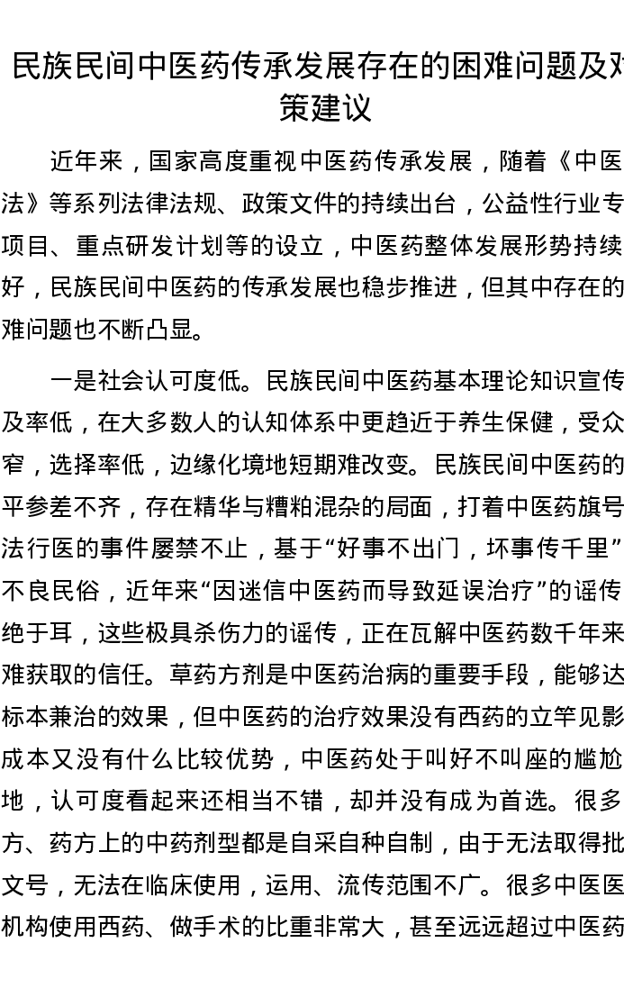 民族民间中医药传承发展存在的困难问题及对策建议