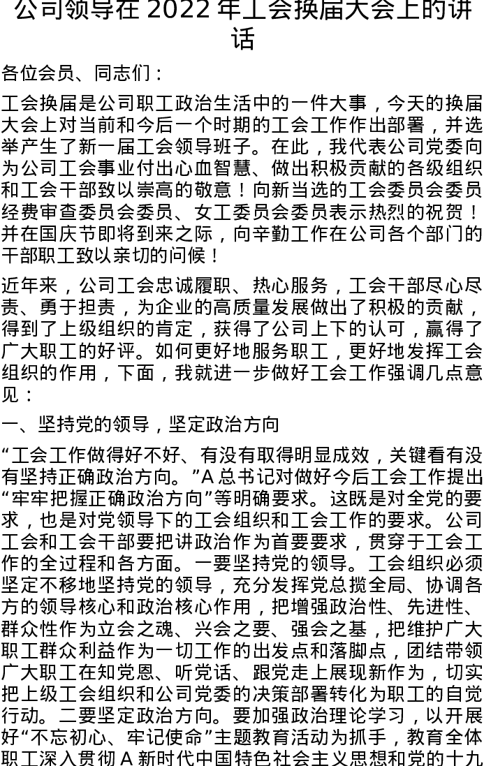 公司领导在2022年工会换届大会上的讲话