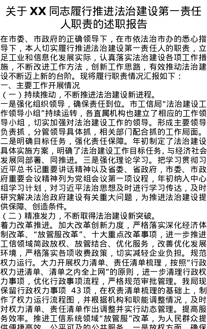 关于XX同志履行推进法治建设第一责任人职责的述职报告