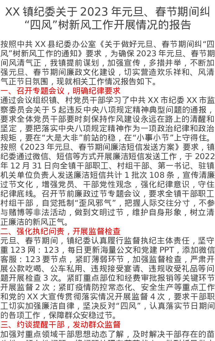 XX镇纪委关于2023年元旦、春节期间纠“四风”树新风工作开展情况的报告