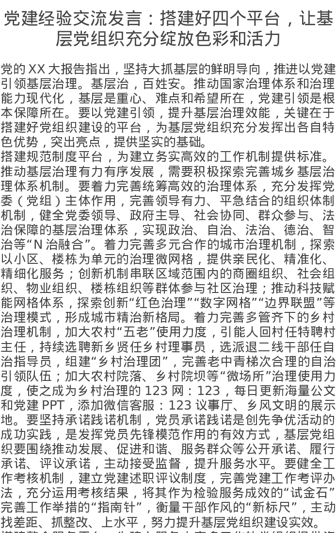 党建经验交流发言:搭建好四个平台,让基层党组织充分绽放色彩和活力