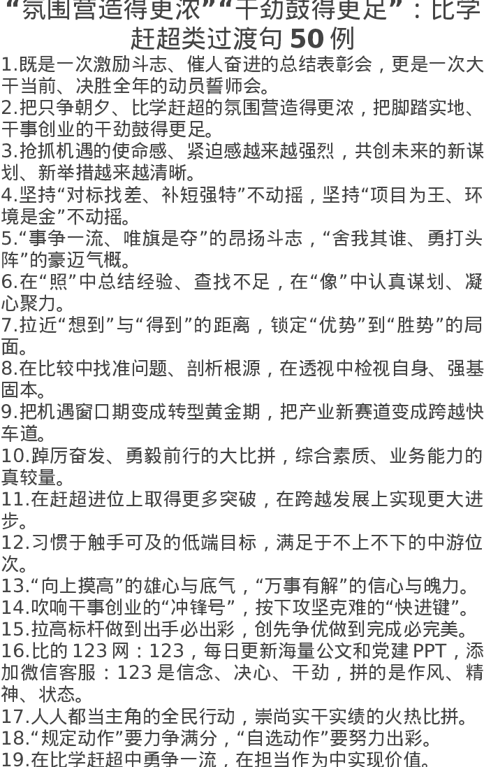 “氛围营造得更浓”“干劲鼓得更足”:比学赶超类过渡句50例