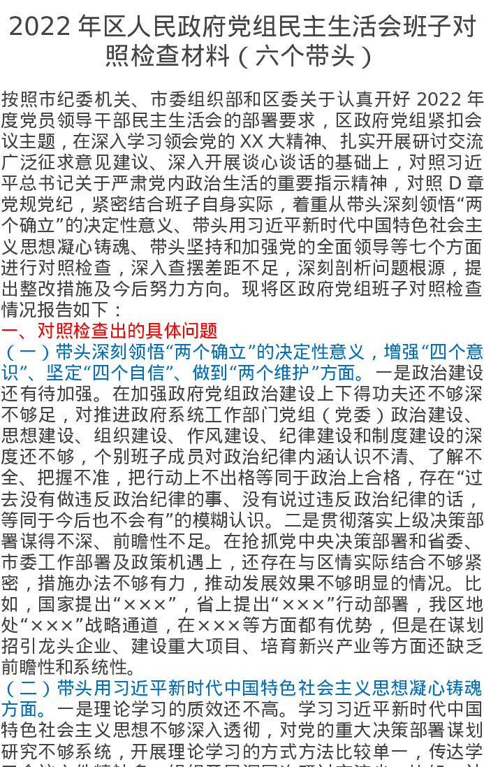 2022年区人民政府党组民主生活会班子对照检查材料(六个带头)