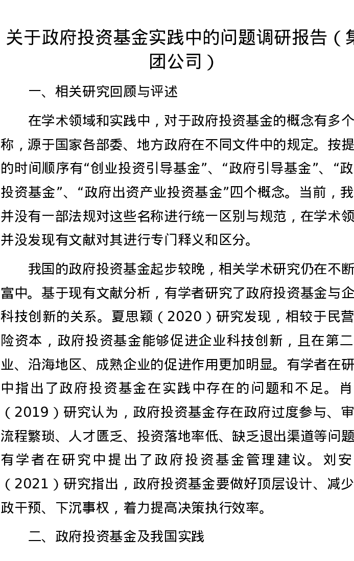 关于政府投资基金实践中的问题调研报告(集团公司)