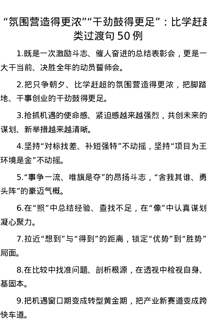 “氛围营造得更浓”“干劲鼓得更足”:比学赶超类过渡句50例