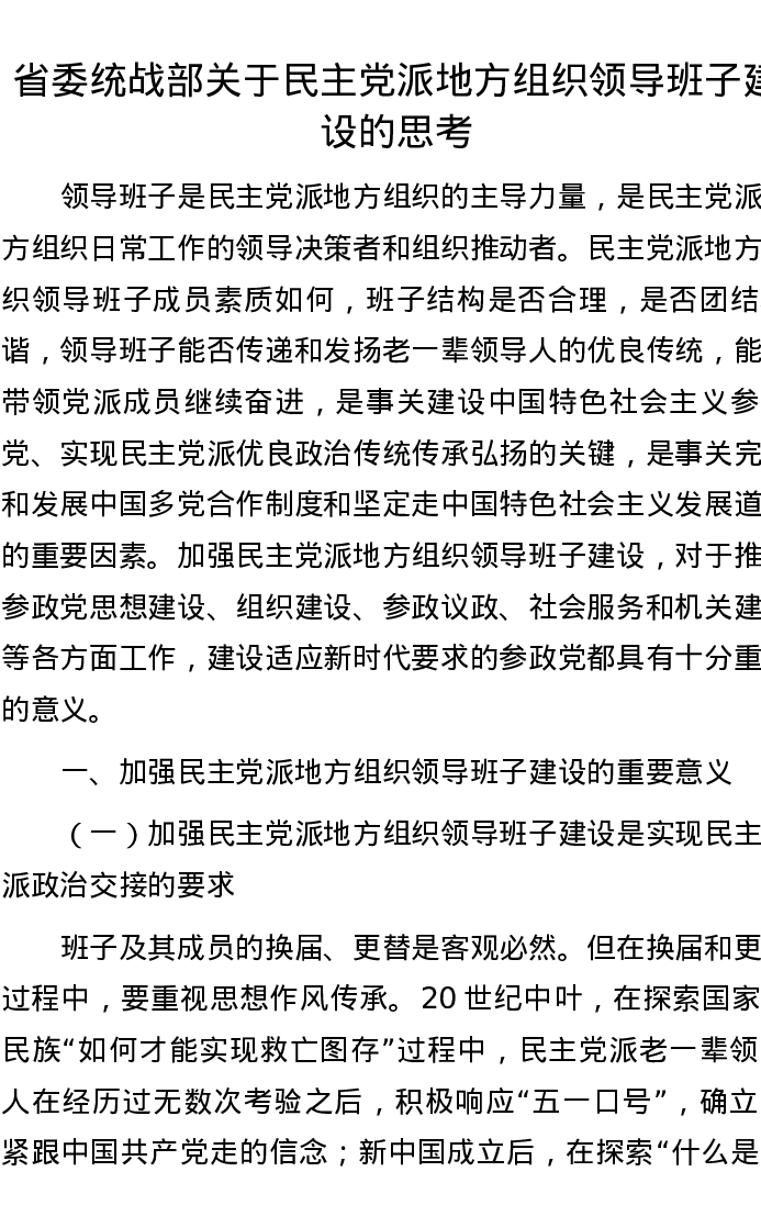 省委统战部关于民主党派地方组织领导班子建设的思考