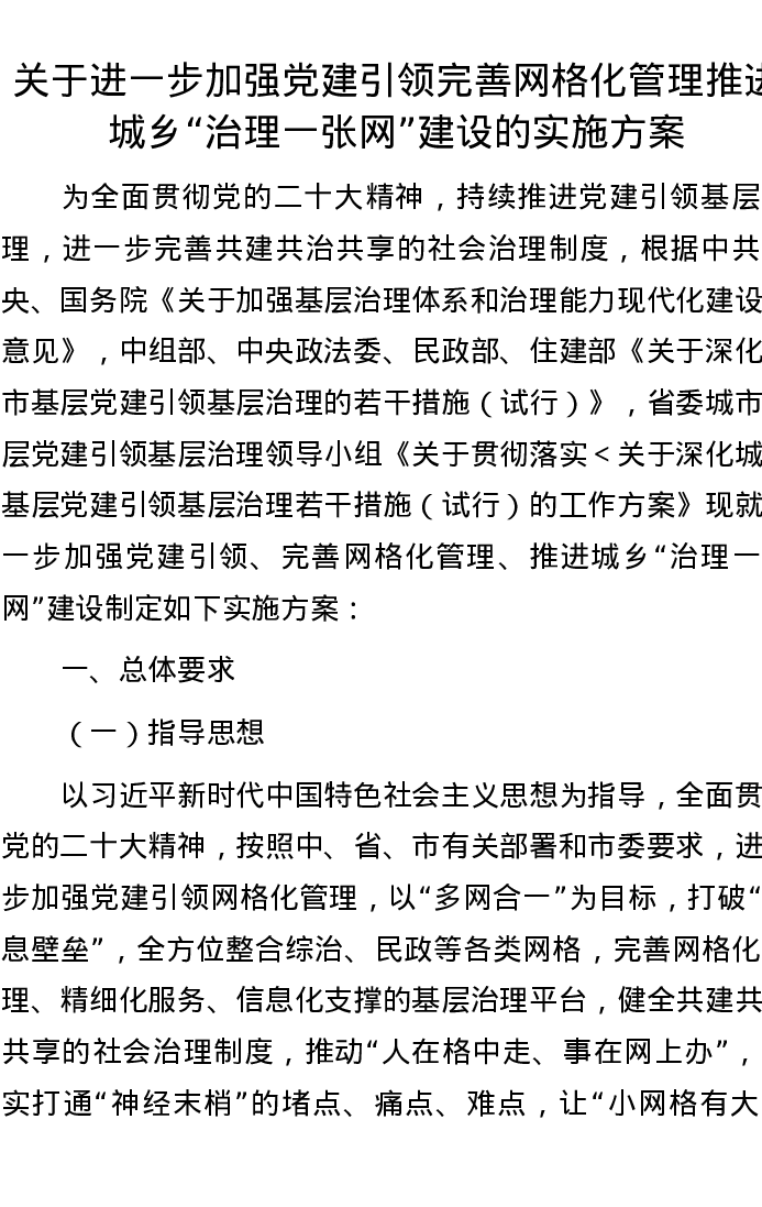 关于进一步加强党建引领完善网格化管理推进城乡“治理一张网”建设的实施方案