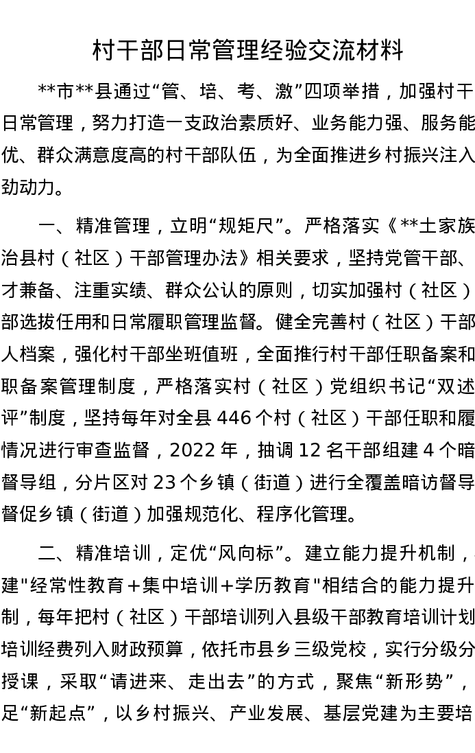 村干部日常管理经验交流材料