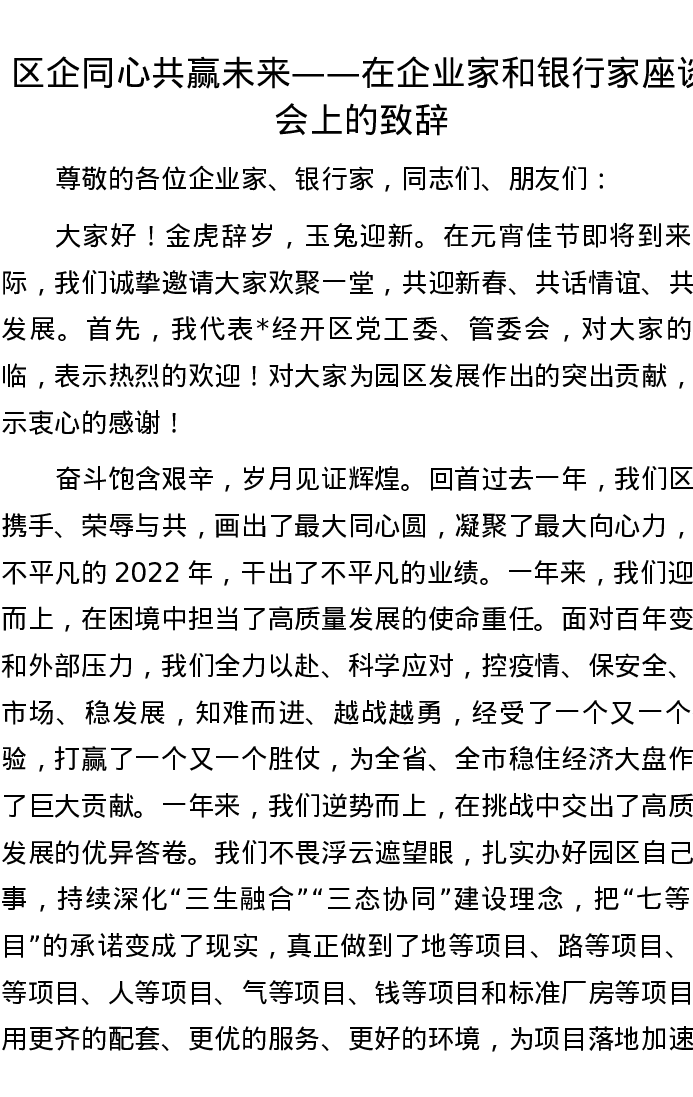 区企同心 共赢未来——在企业家和银行家座谈会上的致辞