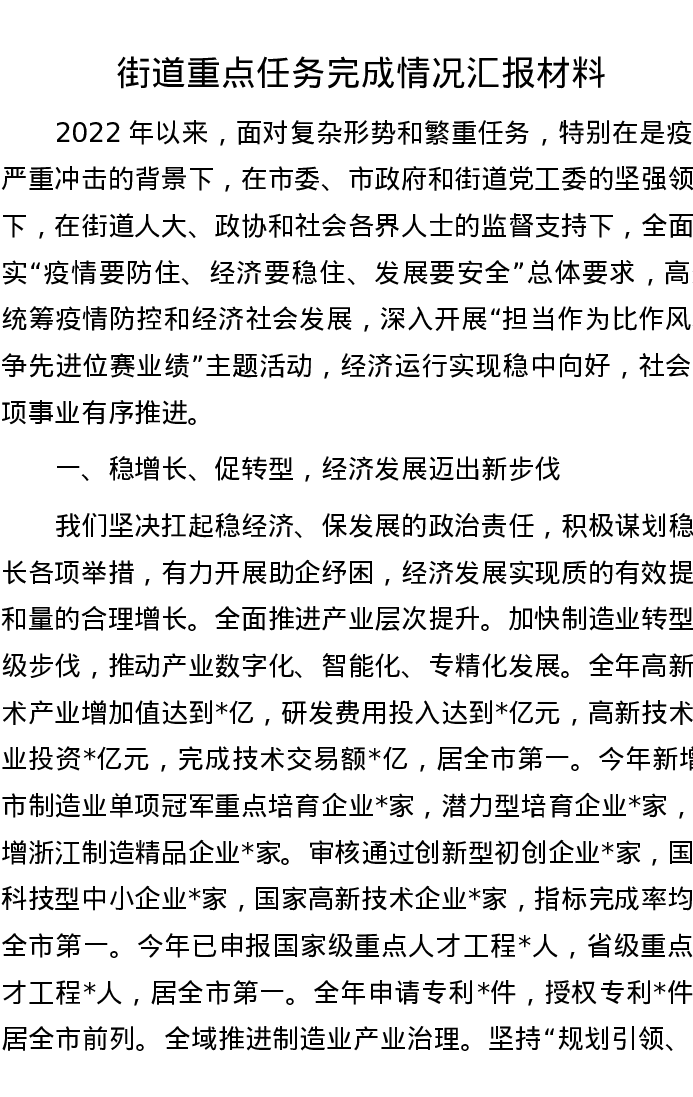街道重点任务完成情况汇报材料