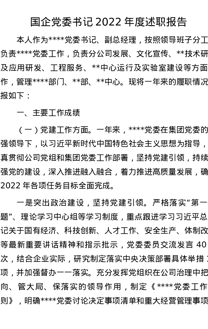 国企党委书记2022年度述职报告