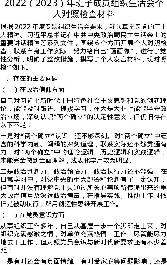 2022(2023)年班子成员组织生活会个人对照检查材料(六个对照)