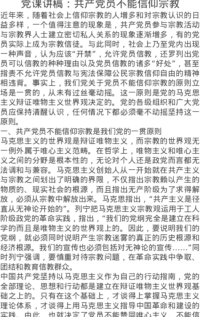 党课讲稿:共产党员不能信仰宗教
