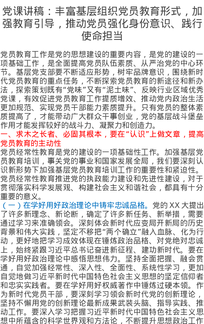 党课讲稿:丰富基层组织党员教育形式,加强教育引导,推动党员强化身份意识、践行使命担当