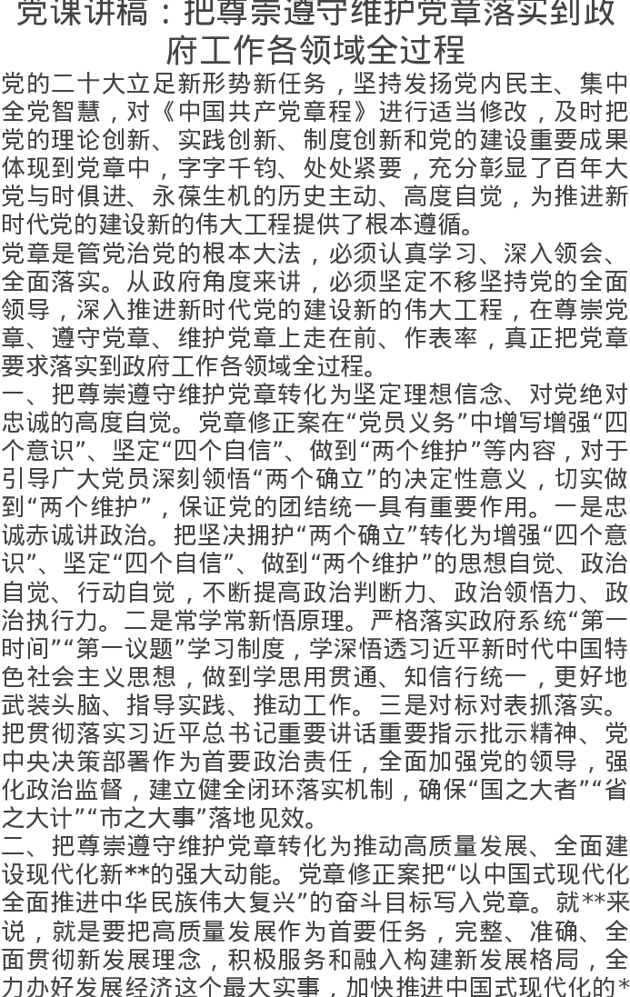 党课讲稿:把尊崇遵守维护党章落实到政府工作各领域全过程