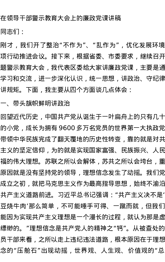 在领导干部警示教育大会上的廉政党课讲稿