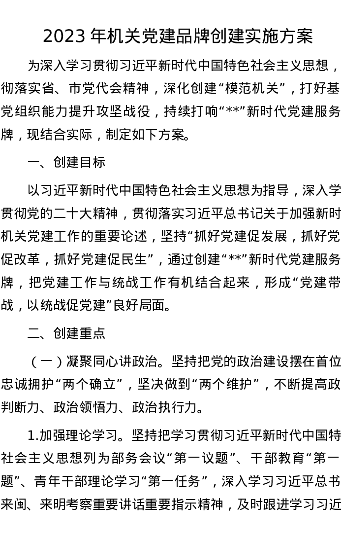 2023年机关党建品牌创建实施方案