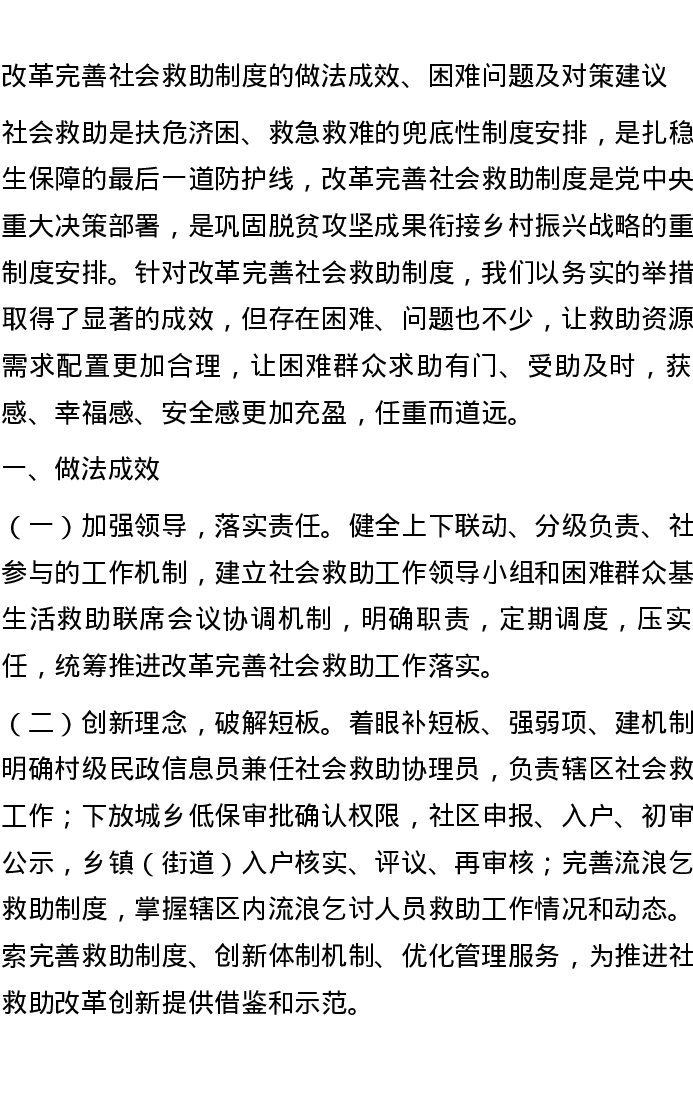改革完善社会救助制度的做法成效、困难问题及对策建议
