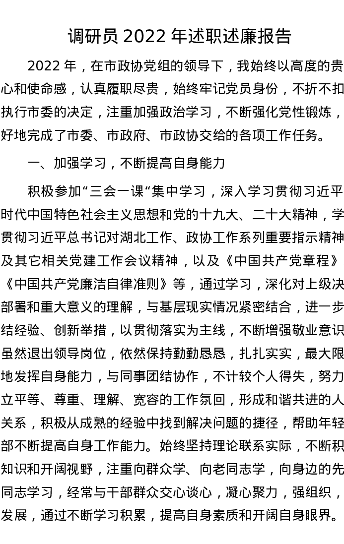 调研员2022年述职述廉报告
