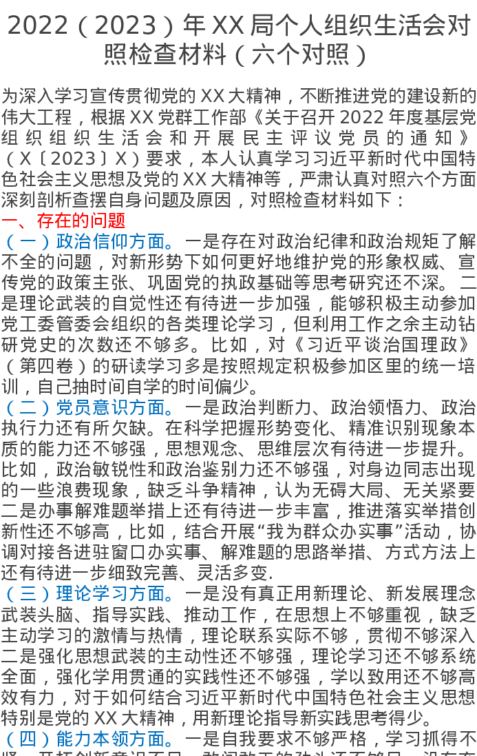 2022(2023)年XX局个人组织生活会对照检查材料(六个对照)