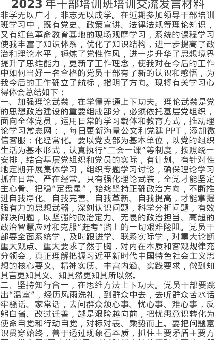 2023年干部培训班培训交流发言材料