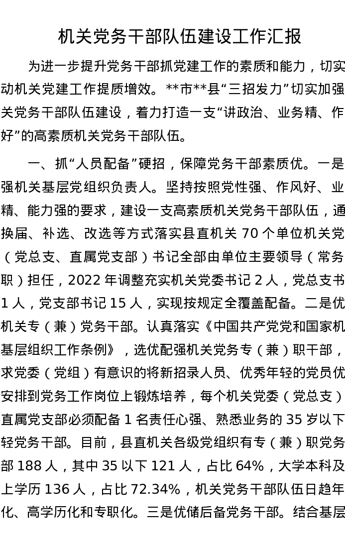 机关党务干部队伍建设工作汇报