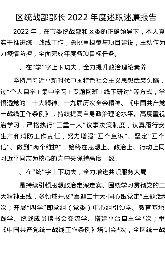 区统战部部长2022年度述职述廉报告