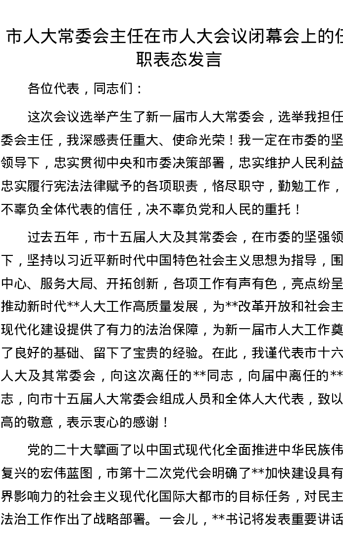 市人大常委会主任在市人大会议闭幕会上的任职表态发言