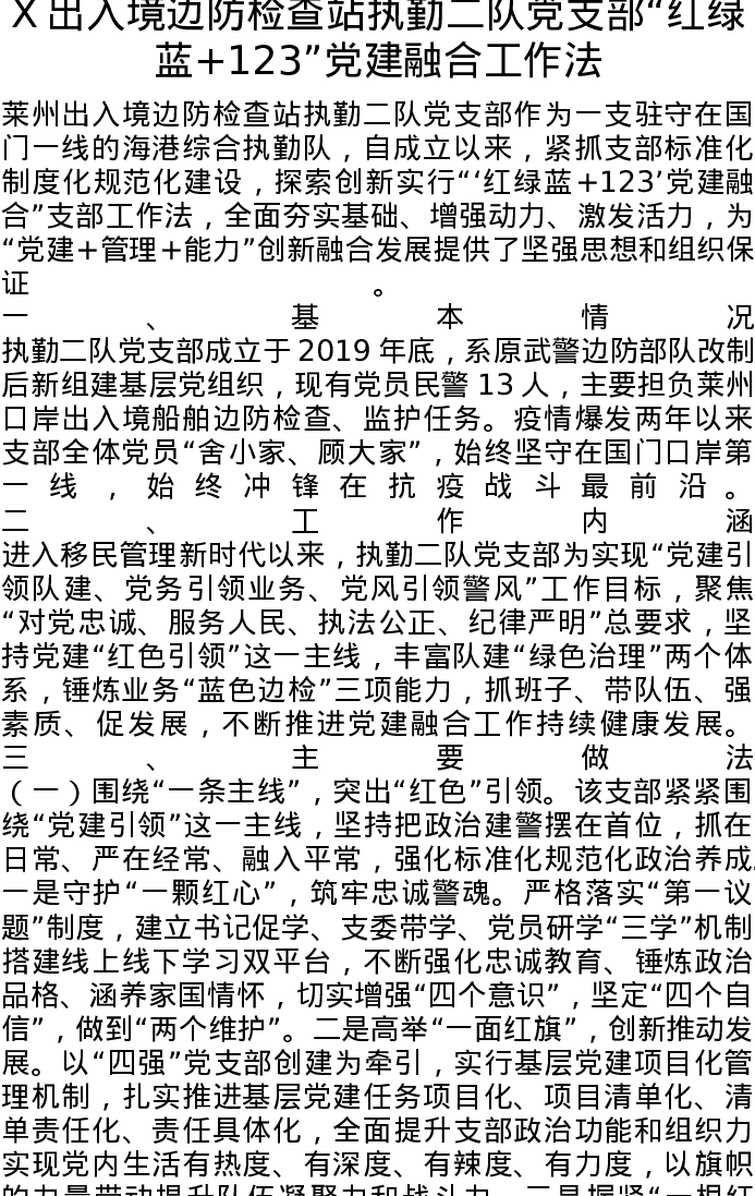 X出入境边防检查站执勤二队党支部“红绿蓝+123”党建融合工作法