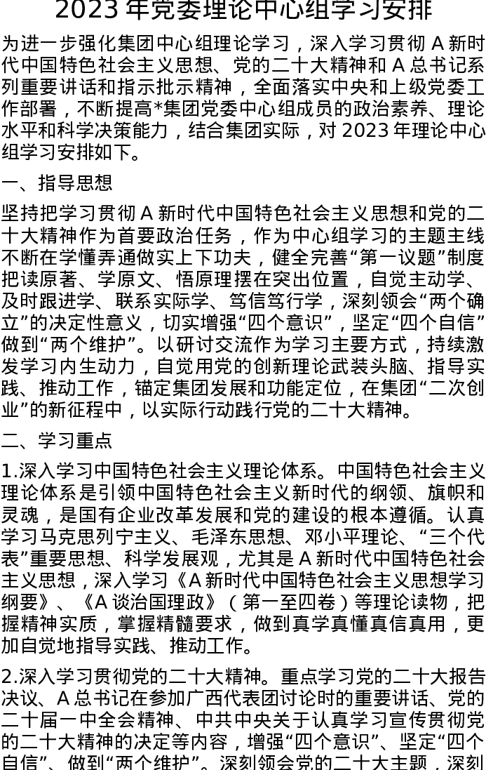 2023年党委理论中心组学习安排