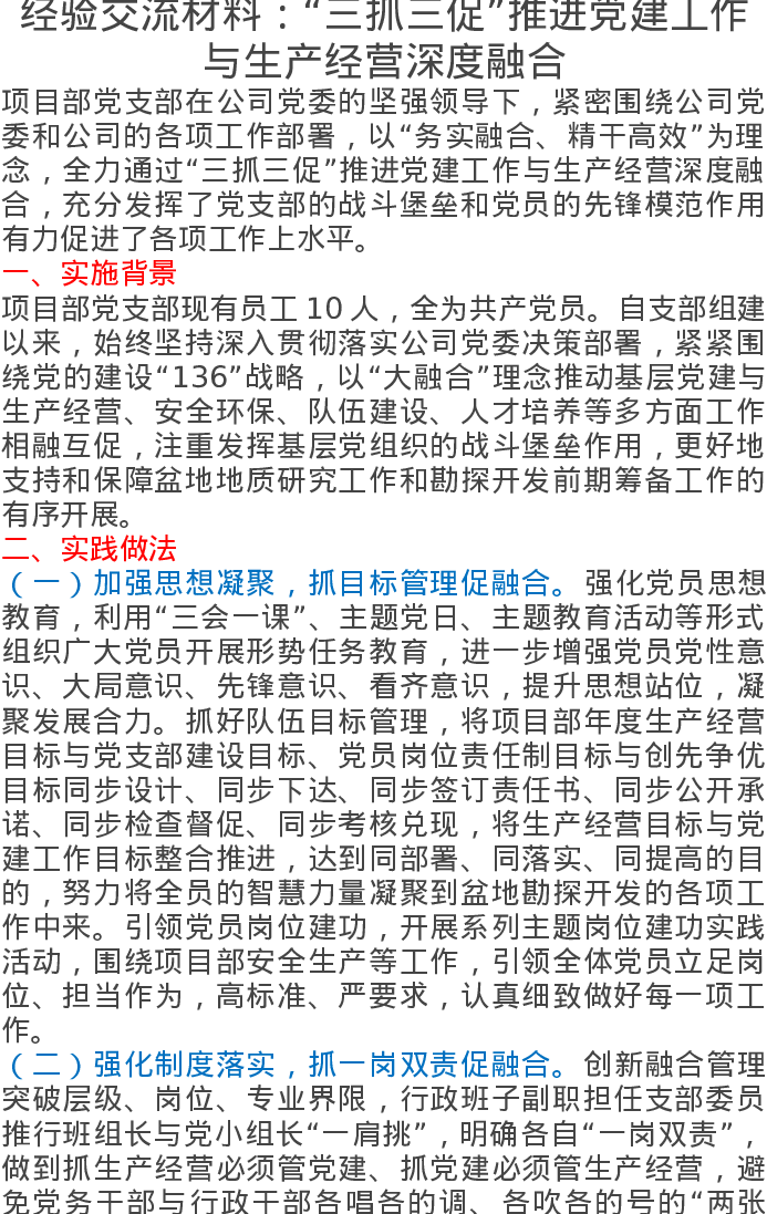 经验交流材料:“三抓三促”推进党建工作与生产经营深度融合