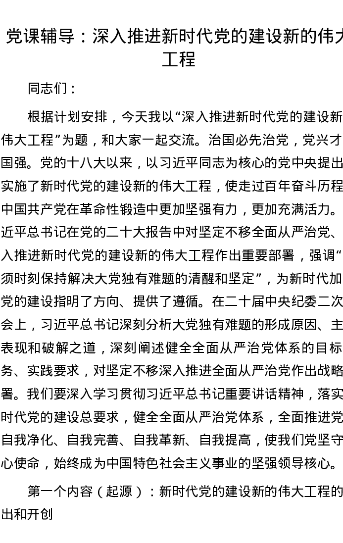 党课辅导:深入推进新时代党的建设新的伟大工程
