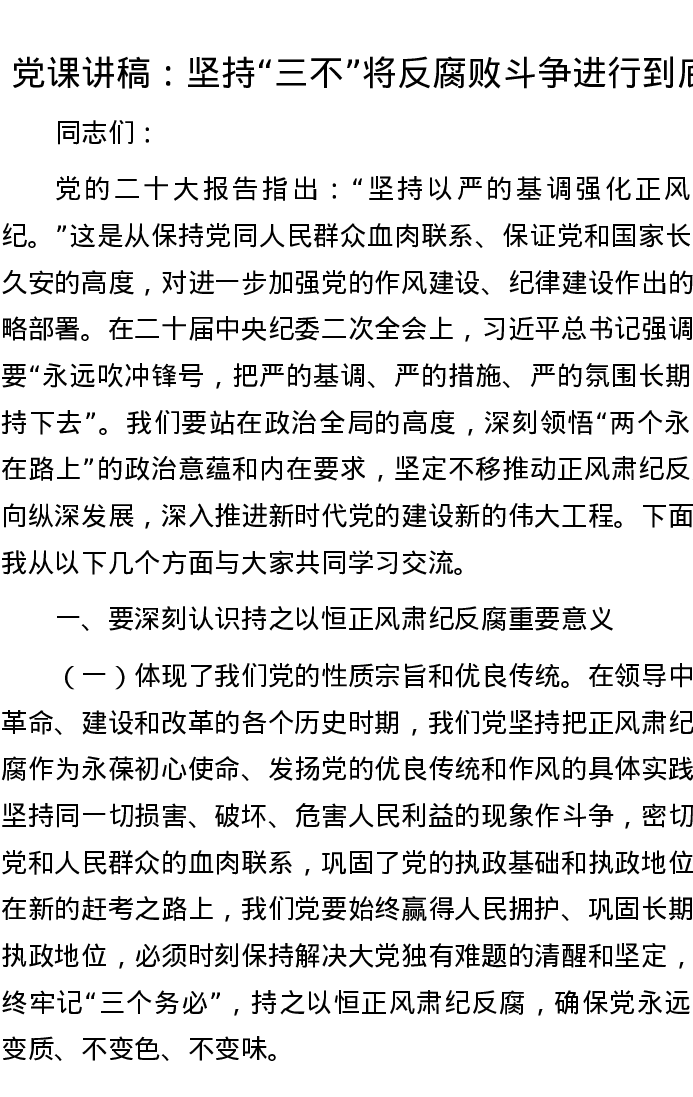 党课讲稿:坚持“三不” 将反腐败斗争进行到底