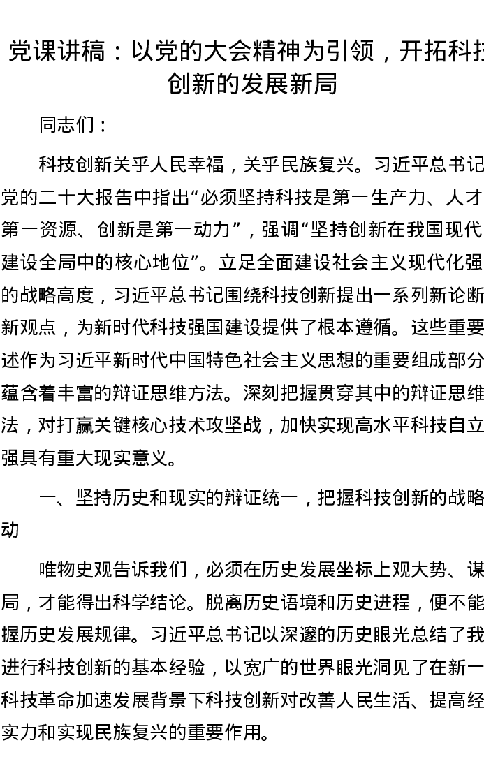 党课讲稿:以党的大会精神为引领,开拓科技创新的发展新局