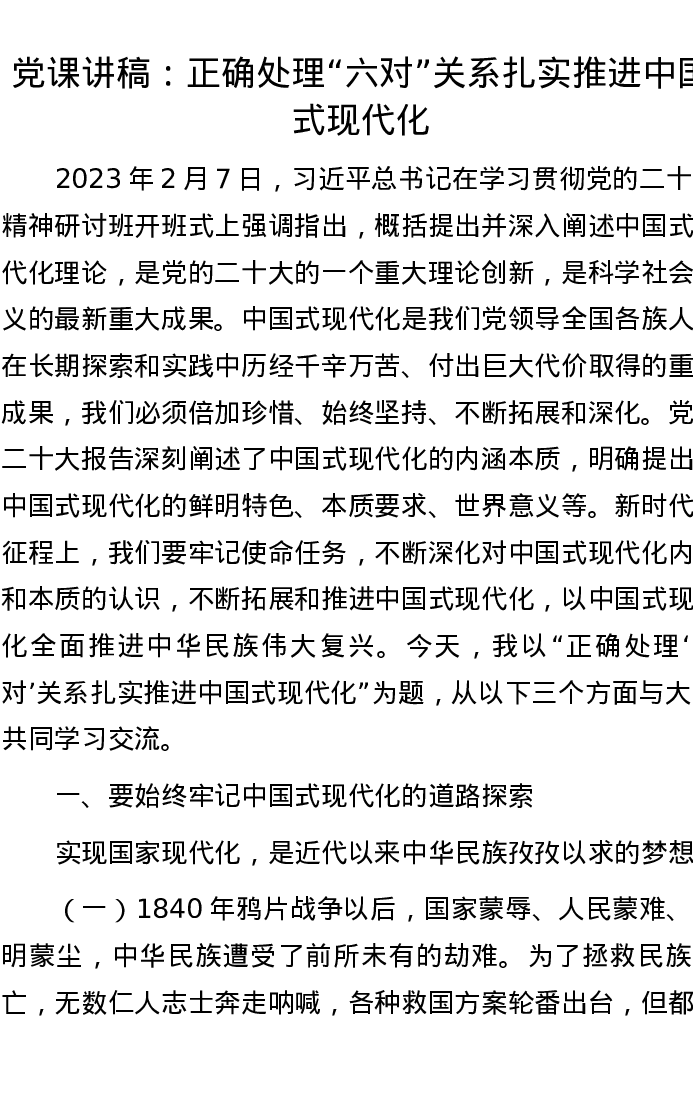 党课讲稿:正确处理“六对”关系 扎实推进中国式现代化