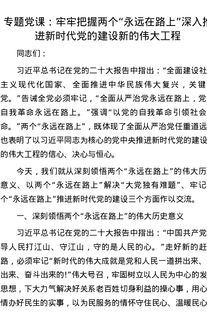 专题党课:牢牢把握两个“永远在路上” 深入推进新时代党的建设新的伟大工程