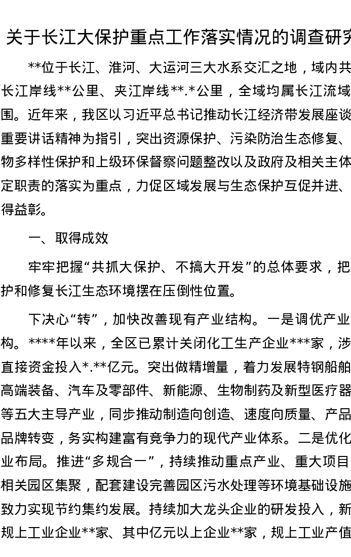 关于长江大保护重点工作落实情况的调查研究
