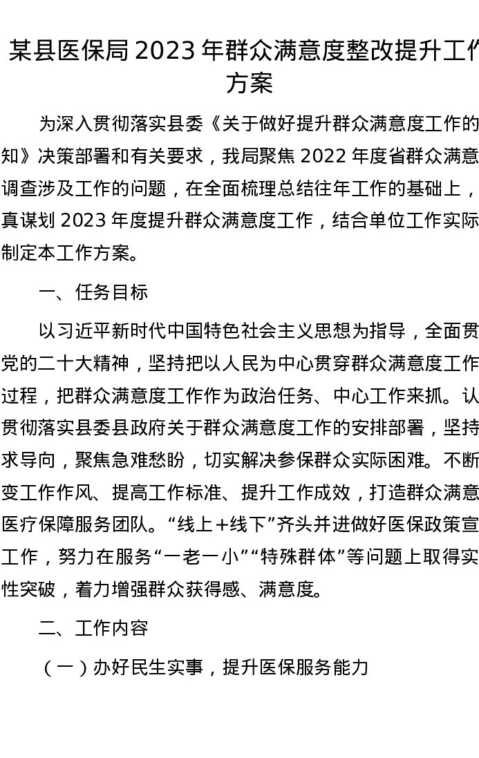 某县医保局2023年群众满意度整改提升工作方案