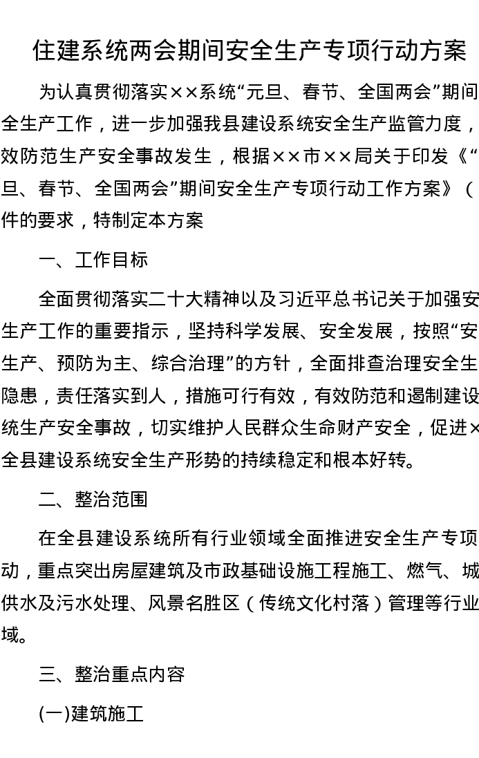 住建系统两会期间安全生产专项行动方案
