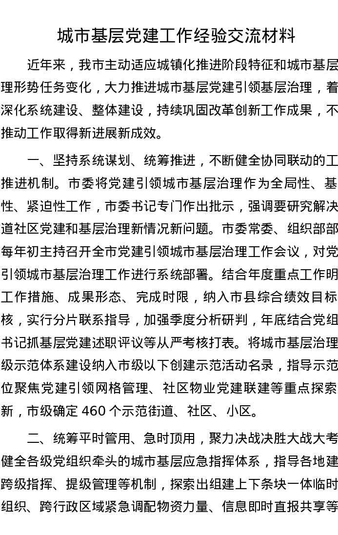 城市基层党建工作经验交流材料