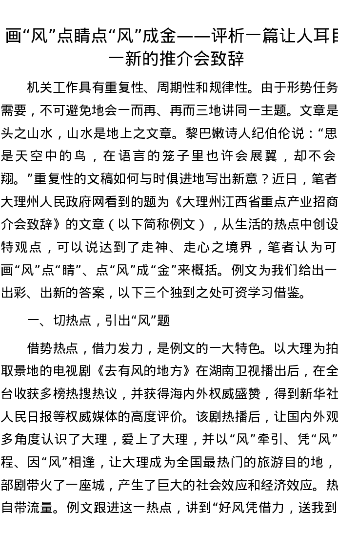 画“风”点睛 点“风”成金——评析一篇让人耳目一新的推介会致辞