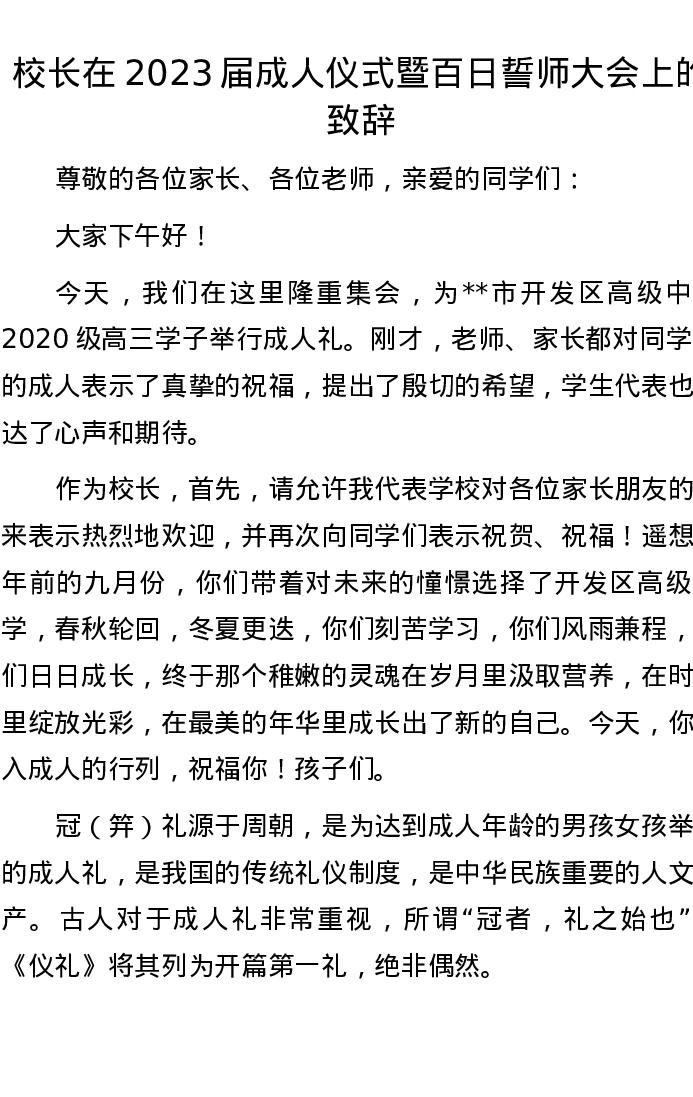 校长在2023届成人仪式暨百日誓师大会上的致辞