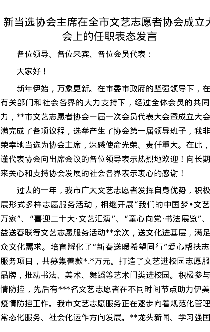 新当选协会主席在全市文艺志愿者协会成立大会上的任职表态发言