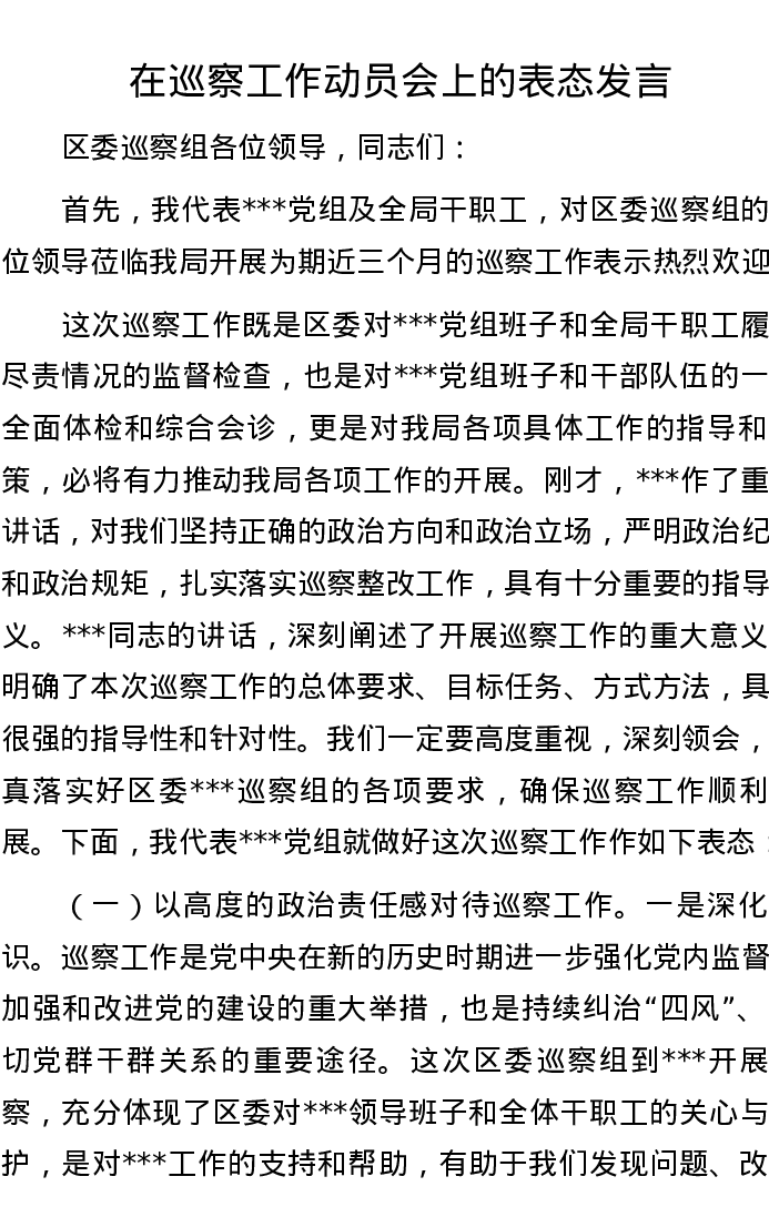 在巡察工作动员会上的表态发言